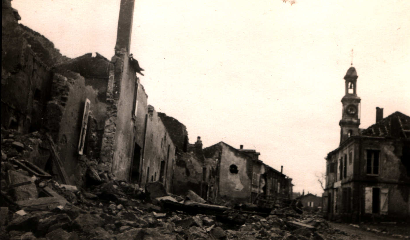 Fin 1944, les Maizièrois reviennent dans une ville dévastée. Le secteur Sud, au-delà du Pont Demange, est totalement détruit, 350 immeubles d’habitation disparaissent totalement. Le secteur Nord ainsi que le secteur Ouest sont moins touchés mais 360 immeubles doivent subir d’importantes réparations. La cité ouvrière appelée « Cité Brosius » est complètement détruite et ne sera pas reconstruite. Le patrimoine communal est également détruit en totalité, à savoir : la mairie, commencée en 1936 et achevée en 1943, l’église, le presbytère, les écoles ou encore la remise du matériel d’incendie. Sur les 4000 habitants, 1000 trouvent à se reloger de façon précaire dans la rue Pasteur et les autres s’installent dans les sous-sols d’immeubles sinistrés. Les services communaux se réinstallent dans un immeuble privé de la rue Pasteur. Dès que le problème du relogement d’urgence est résolu, la municipalité songe à la reconstruction et entreprend des démarches en ce sens dès 1947. En 1948, le Ministère de la Reconstruction et de l’Urbanisme accepte la création d’un premier îlot comportant 16 immeubles d’habitation situés entre la rue des Jardins et l’actuelle rue Jean-Pierre Jean. En 1950, démarre un premier grand îlot comportant 68 immeubles et se termine en 1954 avec le troisième et dernier îlot de 78 logements. Une fois les sinistrés relogés, la municipalité reconstruit ses propres biens. Cette reconstruction démarre avec le groupe scolaire Victor Hugo en 1955, se poursuit par le centre administratif en 1959 qui abrite la mairie, la perception, le bureau des postes, le centre de protection maternelle et infantile, les services municipaux de lutte contre l’incendie, la caisse d’épargne et un bureau payeur de la sécurité sociale.