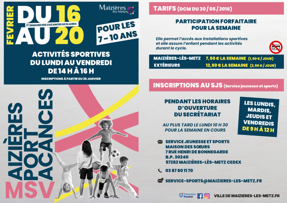 📅 Les inscriptions pour le « Maizières Sport Vacances » démarrent lundi 26 janvier. Vos enfants ont entre 7 et 10 ans ? Faites leur vivre des vacances sportives avec sports collectifs, jeux traditionnels, athlétisme …