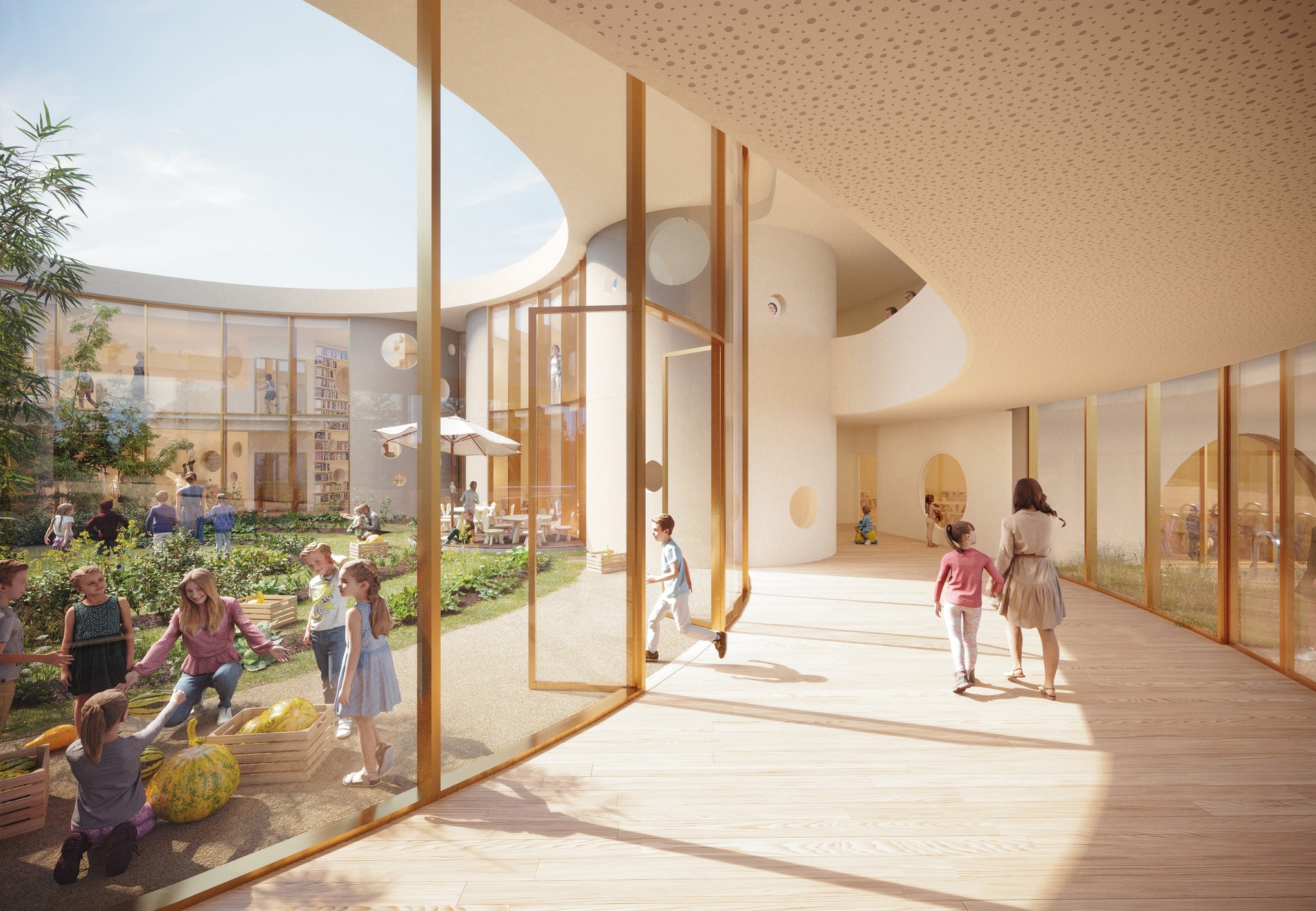 Le projet repose sur une circulation fluide et pensée pour le confort des usagers. Les différents espaces — maternelle, élémentaire, périscolaire, restauration — s’enchaînent selon un parcours logique, limitant les croisements de flux. Les accès sont organisés de façon concentrique autour d’un grand jardin pédagogique central, véritable cœur vivant de l’établissement. Chaque salle de classe et chaque espace d’activité bénéficie d’une double accessibilité : aussi bien de l’intérieur que de l’extérieur, garantissant une grande souplesse d’usage.